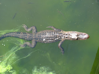 Here is Alex's favorite present the baby alligator. We just were at some pond and there was an alligator. We think there was a bigger one but we never got a chance to see it up close. This one just hung around the dock. Allan took some awesome pictures - I mean a millon awesome pictures of the alligator.